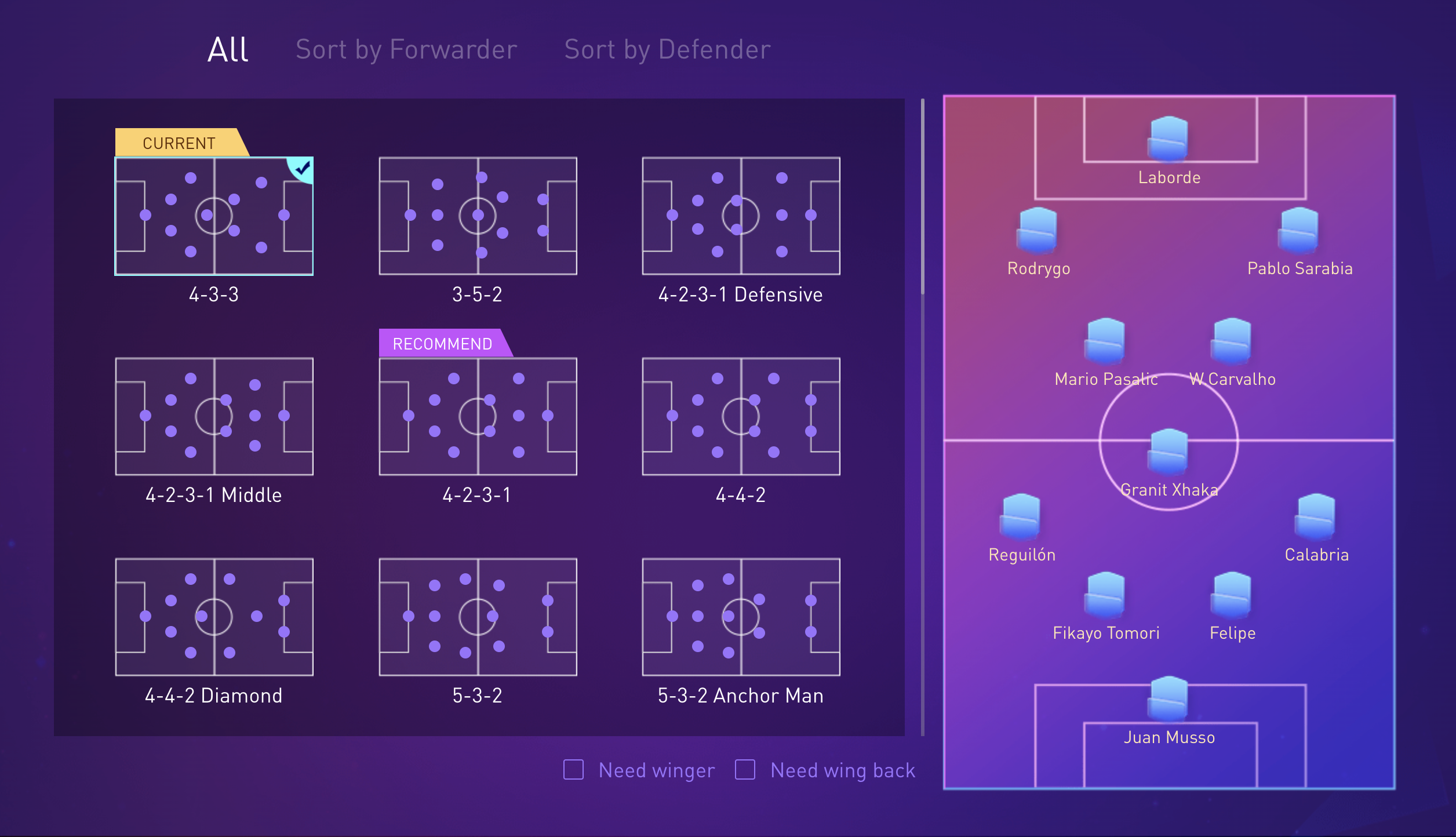 If you are not satisfied with the default formation and want to try a new tactical play, or if you are a big believer in the 3 centre-back formation, you can also change the formation on the "Edit Line-Up" page. Among \~30 mainstream formations supported in S0, choose the one that is most suitable for your players. You can quickly select your favorite formation by filtering your number of forwards and defenders. Often the biggest challenge for managers is to put the best players in the right positions.&#x20;