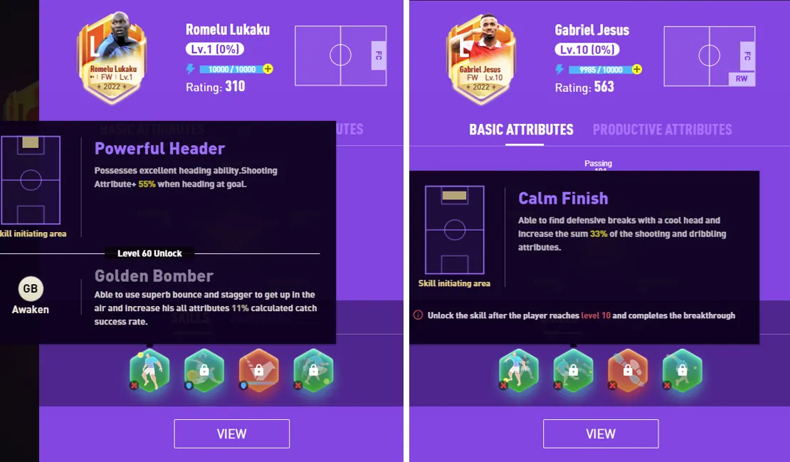 The more preferred formations are 4–4–2 and 3–5–2. It is better for the two FW’s to have different shooting skills to meet different tactics, like “Calm Finish” for one and “Powerful Header” for the other. For example, Jesus in the picture below has “Calm Finish” skill, and Lukaku has “Powerful Header” skill.