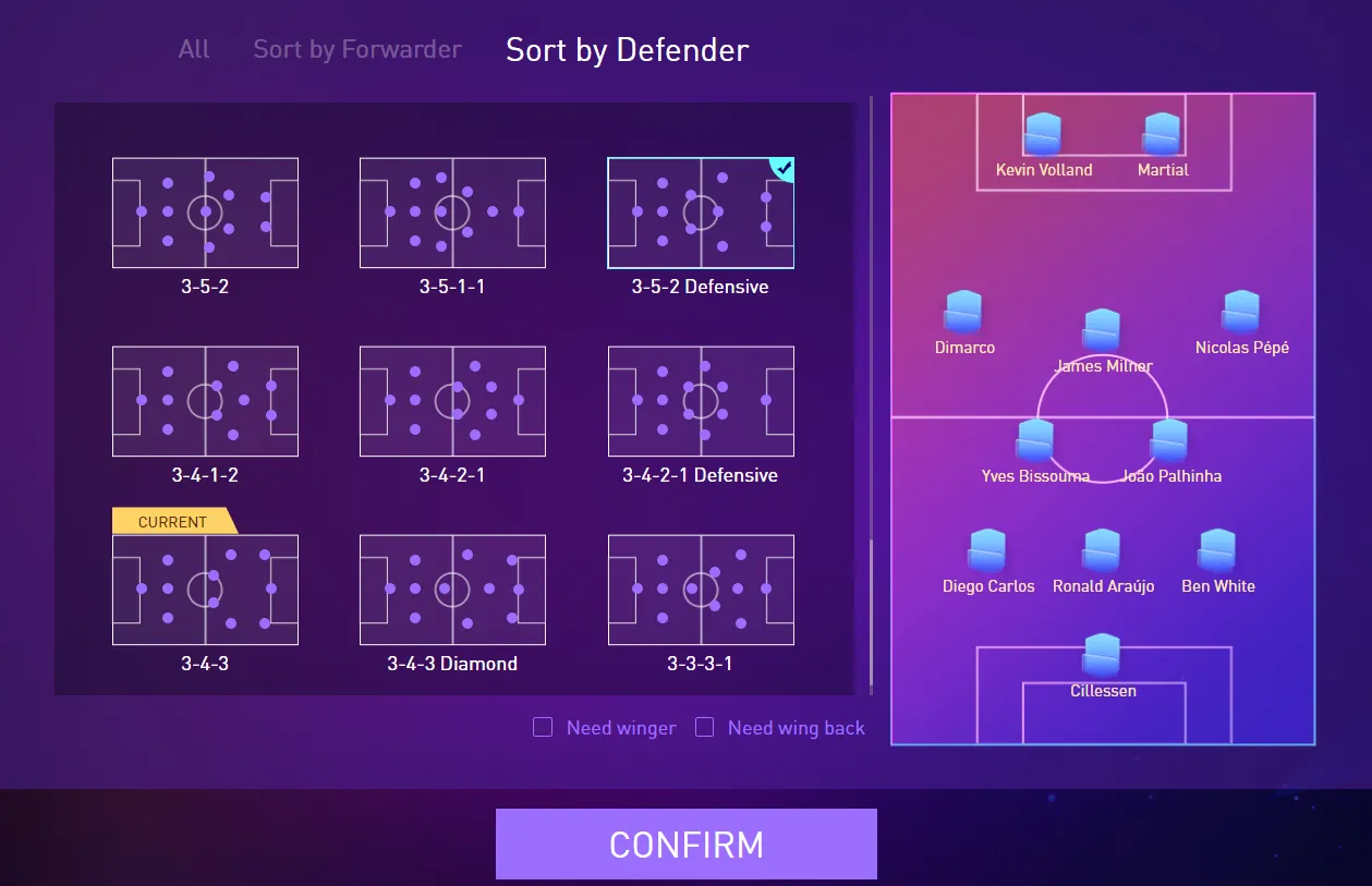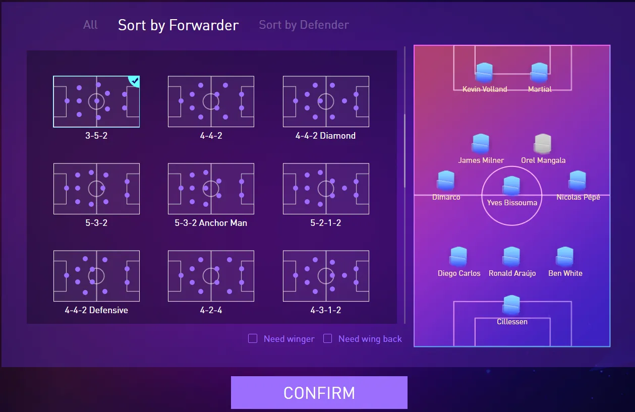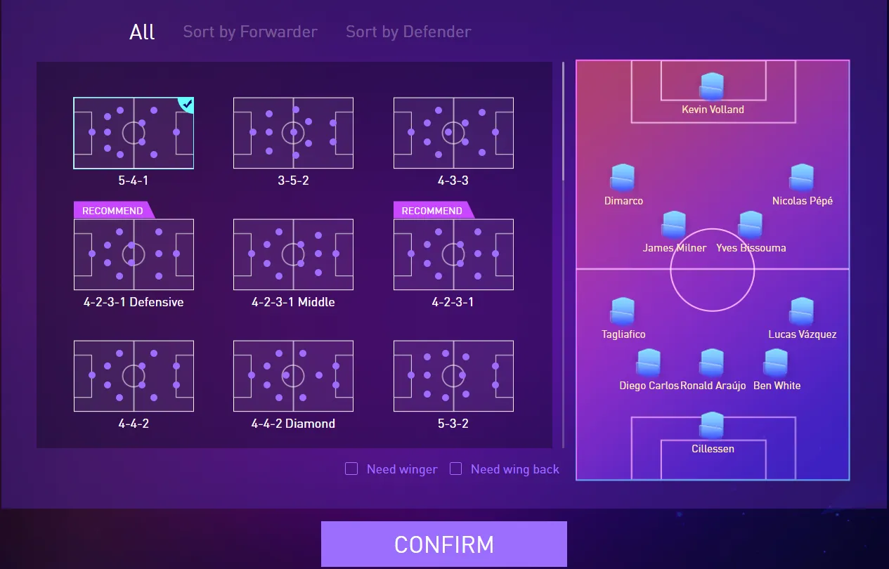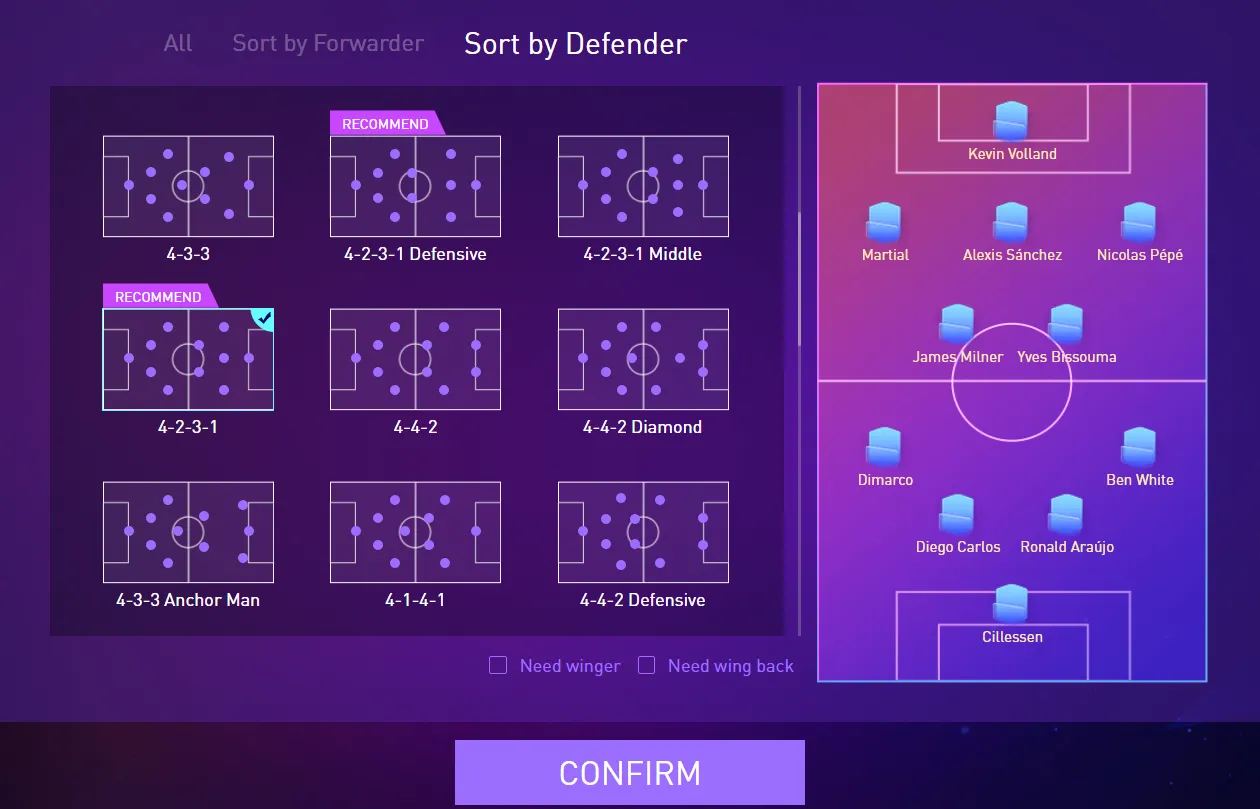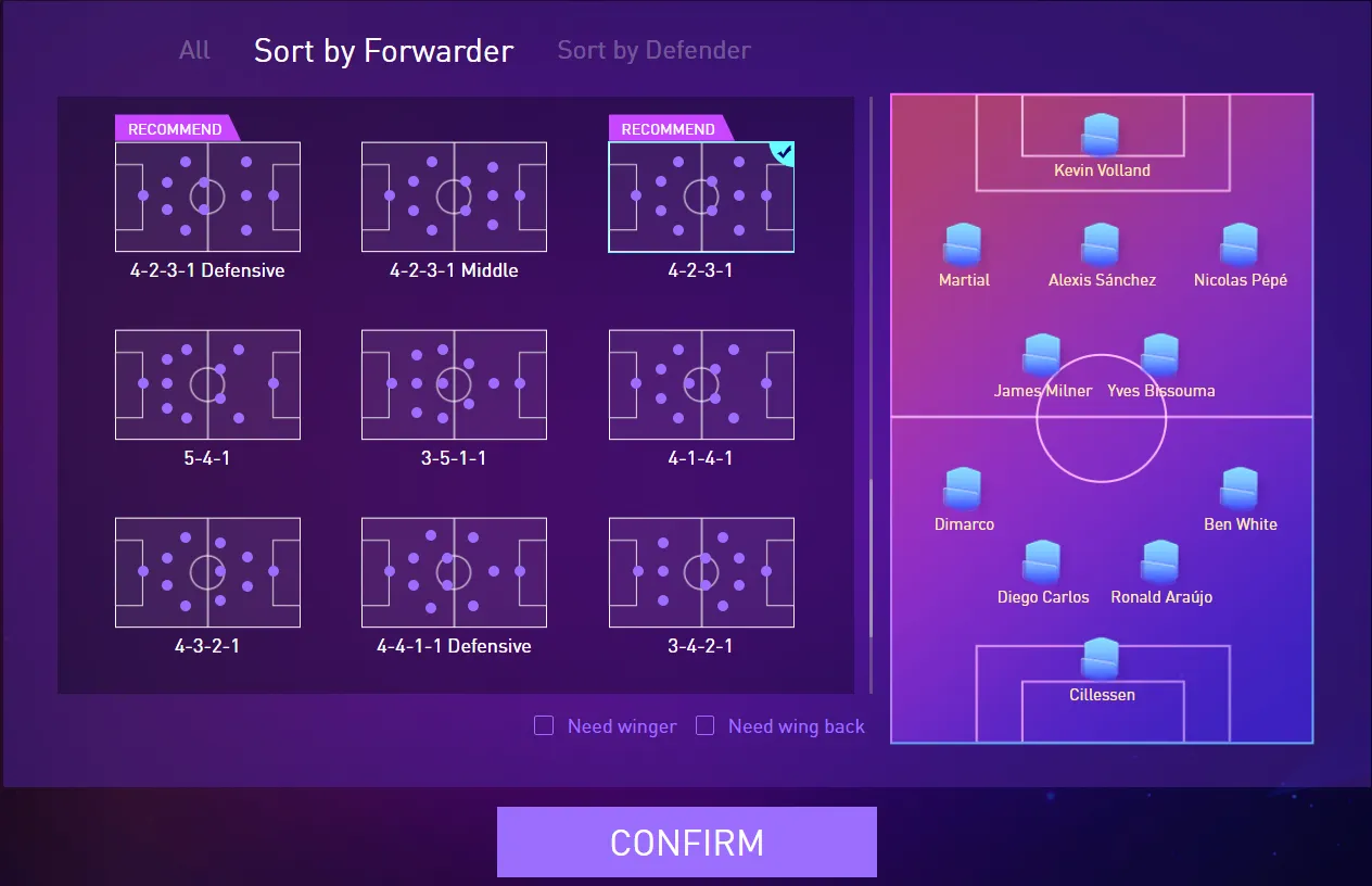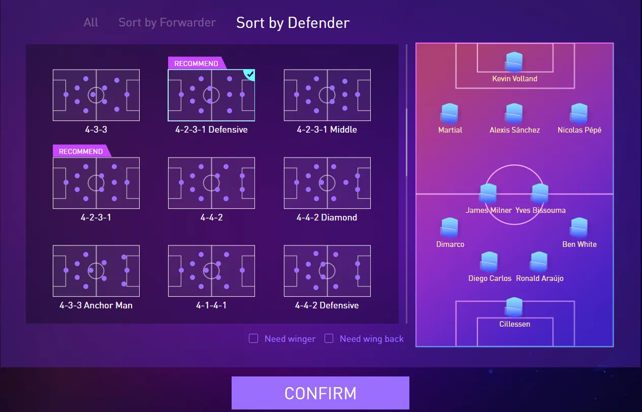 players can further filter by checking {need winger} and {need wing back} options. When you want to play on the wing, you can tick the {need winger}, so that the system will help you filter the formation suitable for the wingers. When you need to strengthen the wing defense, you can tick {need wing back}, so that the system will help you to filter the formation suitable for wing backs.