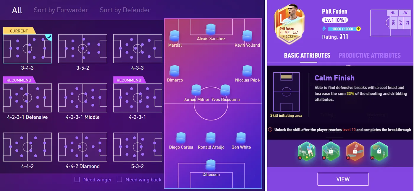 When entering the game, your default formation is 4–2–3–1 which is the one of the mainstream formations. At the same time, the system will recommend a formation based on your cards. The recommended formation can maximize the number of cards with high combat power to be chosen. You can also decide the right formation based on your player’s skills and/or the tactics you want to play. Putting high-power cards in the most suitable positions will greatly improve your winning rate. Meanwhile, the recommended formation is not static. For instance, when you buy a new card and its combat power is relatively strong or when some of your cards are running out of stamina, the recommended formation will change accordingly.