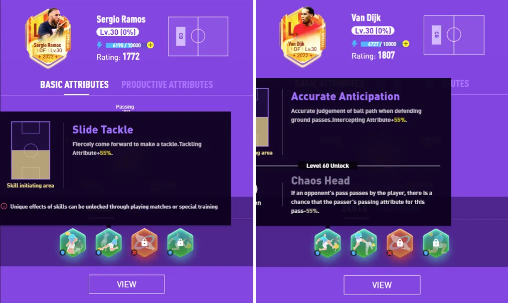 It is recommended to have a five DF formation, like 5–3–2 or 5–4–1. Yet defense is less a matter of number of DF’s, but a matter of their skills, rarity, relative rankings, and where you put them. The ideal situation for a number of central defenders in front of the last line of defense is that their skills can complement each other and try to gather more defensive skills such as “Slide Tackle”, “Aerial Defense”, “Accurate Anticipation” and etc. In this way, no matter what attacking methods the opponent uses, you can have enough counter methods. For example, Van Dijk in the picture below is excellent in interception attributes and has “Accurate Anticipation” skill, while Ramos is relatively good at stealing attributes and has “Slide Tackle” skill.