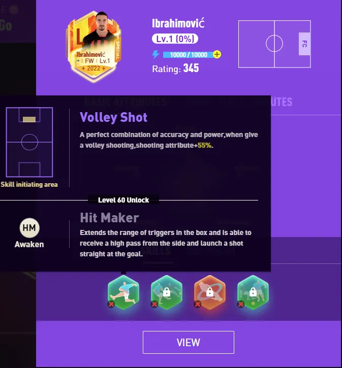 You can choose a single FW formation such as 4–2–3–1. This formation has high requirements on the single FW who serves as the attacking arrow. It is best for the card to have multiple shooting skills or both shooting and dribbling skills. For example, Ibrahimovic in the picture below has both “Volley Shot” and “Calm Finish” skills. The first can meet the ground short pass and penetration tactics; the second can meet the long pass and rushing tactics.